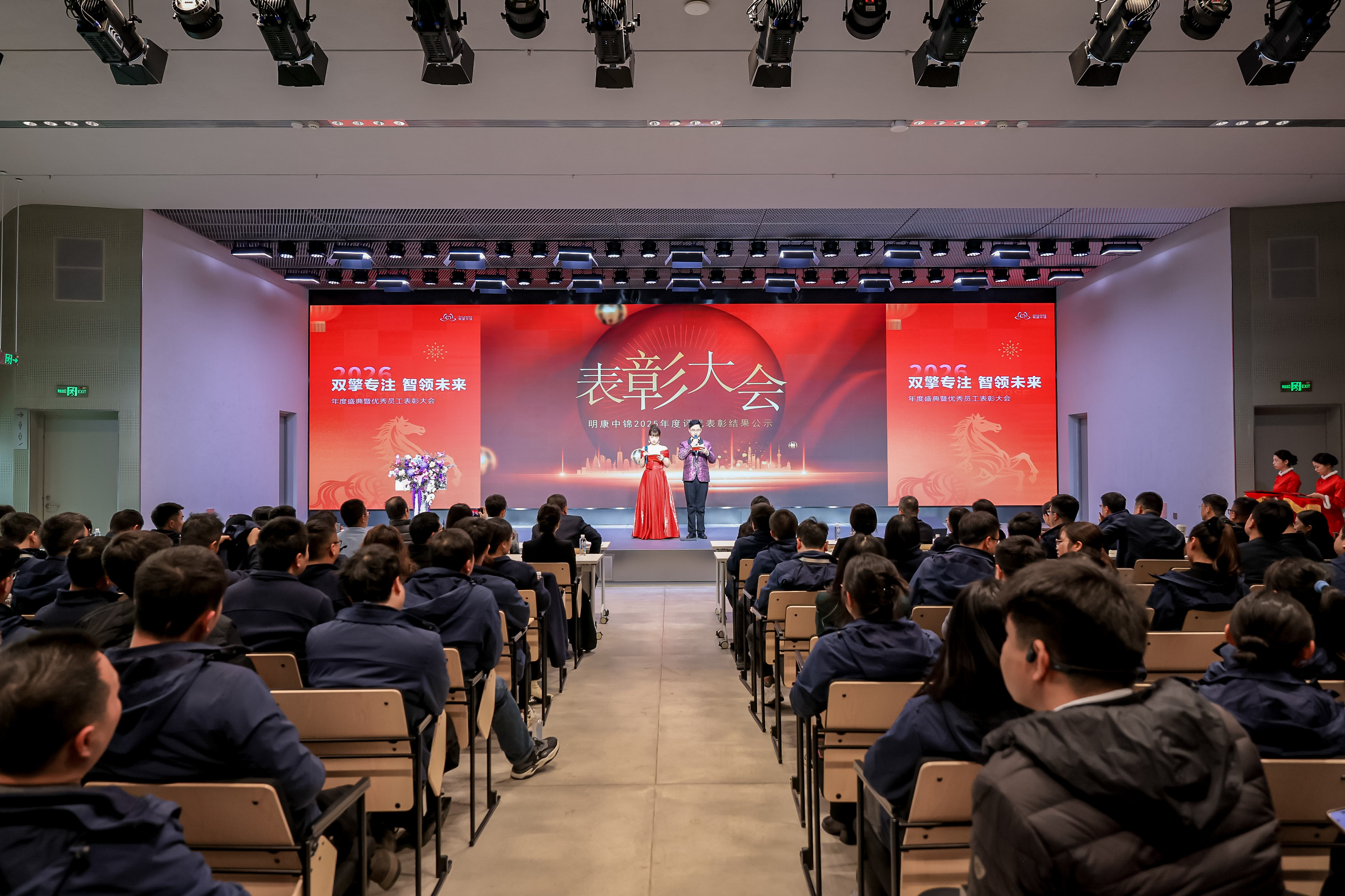 岁序更替,华章日新。2026年2月8日,明康中锦“双擎专注 智领未来”年度盛典暨优秀员工表彰大会隆重举行。全体明康人欢聚一堂,回望2025年的奋斗足迹,共启2026年的崭新篇章。年会在庄严的国歌声中拉开序幕。全体明康人肃立齐唱,目光坚定,展现出明康人不忘初心、砥砺前行的坚定信念。